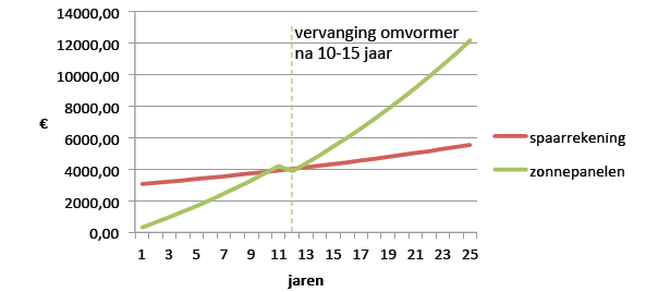 Bij 2,5% spaarrente en 4% prijsstijging van stroom per jaar is de afweging tussen sparen en investeren in zonnepanelen (hier zo’n 6 stuks):